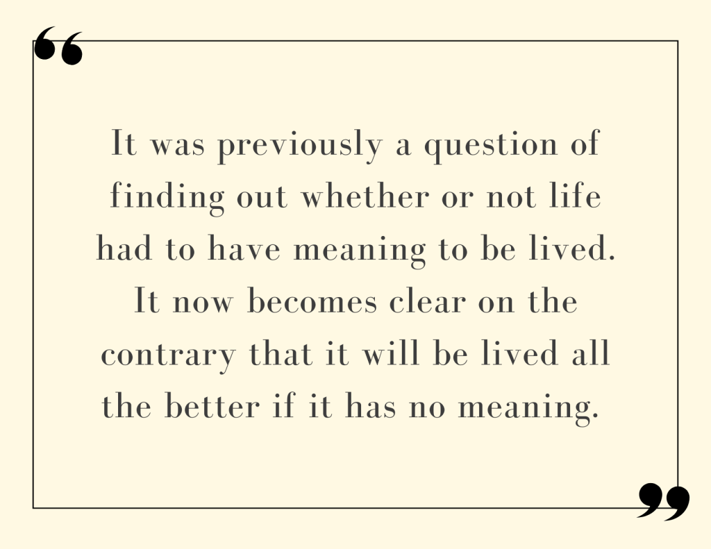 Camus’ realization is not only that it is possible to live in spite of life’s meaninglessness, but that meaninglessness is actually what makes life worth living. If god exists (if a rational order, and if meaning, exists), everything depends on him, and we can (and, who knows, maybe we should) do nothing against his will. If he does not exist, everything depends on us. Thus, the realization that the universe, and our existence, is meaningless, leaves us utterly free to choose what to do, and who to be (“There is no frontier between what a man wants to be and what he is”).
