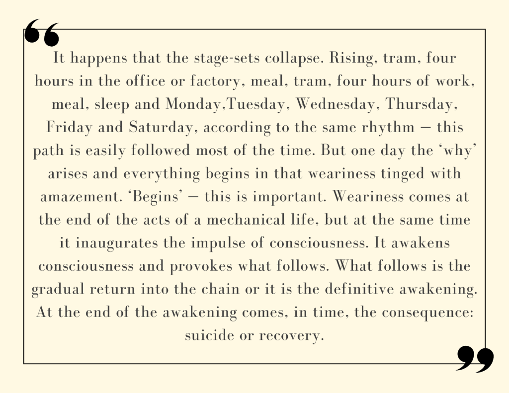[All quotes from: A. Camus, The Myth of Sisyphus, Penguin Books, London (2005)]